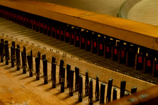 Little is known of William Smith save that he was apprenticed to Benjamin Slade in 1709, probably in succession to Thomas Hitchcock. Like Tisseran it shows the connexion with spinets in its diagonally set soundboard. An affinity with Hitchcock is shown by the skunktail sharps, a graphic term to describe keys which are striped like the tail of a skunk with a longitudinal sandwich of ebony-ivory-ebony. However, the tail of the case is the normal English shape, not the rather Germanic curve which Hitchcock employed on his only surviving harpsichord.